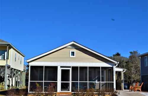 Relax in this adorable newly renovated beach house that is just one block away from Oak Island's sand and surf. This house boasts a large screened porch with rocking chairs for relaxed lazy days and stargazing summer nights. The beds are comfy and the bathrooms are roomy and the living room boasts a new sectional couch that has a Queen pull-out bed for extra guests. TVs are in the living room and in each bedroom. The house is pet friendly and has a large completely fenced back yard for pets, games, grilling and picnics!