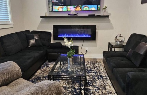 Beautiful living room with 65" smart TV 50” Smart TV in Bedroom and in the Kitchen perfect for movie nights or watching YouTube for Recipes