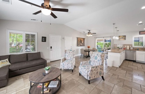 The living room opens up to your own private outdoor desert paradise with something for the entire group. The beautifully landscaped backyard features an outdoor dining table, couch seating area with a 65" outdoor TV, 2fire pits, 2 gas BBQs, ping pong table, cornhole and more!