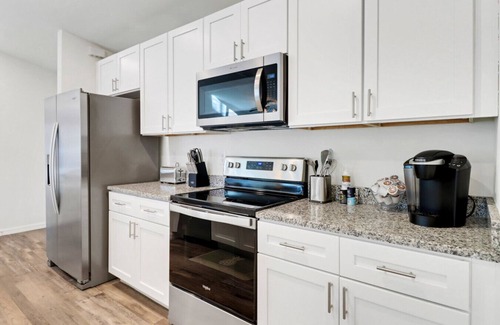 Time to eat? The fully equipped kitchen features plenty of space to cook and includes an island complete with seating for 4. While the modern kitchen is pretty to look at with its stainless steel microwave, stove/oven, fridge, dishwasher and ample counter space it also boasts everything you could possibly need. Keurig Coffee Maker with KCups provided along with creamer, sugar, and stirrers makes waking up in the morning a breeze. Plates, bowls, mugs, glasses, silverware,knives, pots & pans, blender, toaster, oven mitts and more are there to make you feel right at home.