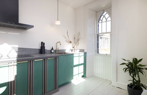 ⭐ Fully equipped kitchen with stunning outlook across Calton Hill to the National Monument. Drawing on the Monument for inspiration, artist Thomas Aitchison was commissioned to produce a bespoke fitted kitchen which reflects its iconic silhouette.