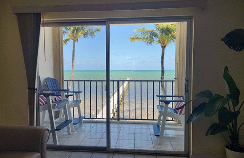 We are delighted to offer this 2 bedroom, 1 1/2 bathrooms OCEANFRONT TOWNHOUSE!!! Breathtaking views off of all 3 balconies catching the sunrise and sunset. This home can sleep 4 people with a pull out sofa and one of the upstairs bedrooms has a king size bed with a daybed. Upstairs you will also find a nicely updated full bathroom between the 2 main bedrooms. The second bedroom has a king size bed with a balcony overlooking the ocean. Spacious closets and we pride ourselves on cleanliness. Kitchen has a dishwasher, refrigerator, stove, microwave and is equipped for preparing all your meals. Towels and linens are provided. Washer, dryer and air conditioning available. Amenities include Gated Community, Pool, Longest Private Fishing Pier in Islamorada, Sauna, Club House, Gym with Ocean View, Additional freezer to store FISH in, Elevator, and Covered Parking. Launch your paddle boards or kayaks right from the pier. Conveniently Across the street to Founders Park, Close to Theatre of the Sea, Shopping, OceanFront Restaurants, Snorkeling Reefs, Scuba Diving, WORLD CLASS FISHING, and Marine Life Galore!!! This place is just waiting for you to unpack, relax, and experience the JOY of life!
