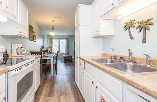 This spacious 1-bedroom home sleeps up to 4 persons with a King Size Bed in the Primary Bedroom and a Queen Sleeper Sofa in the Living Area. It has a beautiful, updated walk-in Shower in the full bathroom, and Smart TV's in each room. The kitchen is fully stocked with all you need to whip up an awesome meal for your small family. The private balcony sits off the kitchen and faces the North (not the beach), or you can pull a chair out on the front walkway and watch the kiddos swim in the complex pool, just right at the bottom of the stairs.