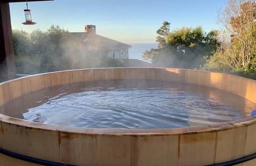 The property is over half an acre and completely fenced - offering plenty of space for kids and dogs to play! The fence is 5 to 6 feet tall and should work for most dogs except for determined escape artists. A wrap around deck offers views of the Gualala River, Pacific Ocean, and California coast. Cedar wood hot and cold tubs for hydrotherapy on the deck - on a clear night the stars and Milky Way are on full display. Start with the hot and then the cold - alternate back and forth to feel like a million bucks. The deck has two picnic tables and a gas grill. A tree platform in the backyard provides unobstructed views of the river and the ocean - a great spot to read and nap in the hammocks.