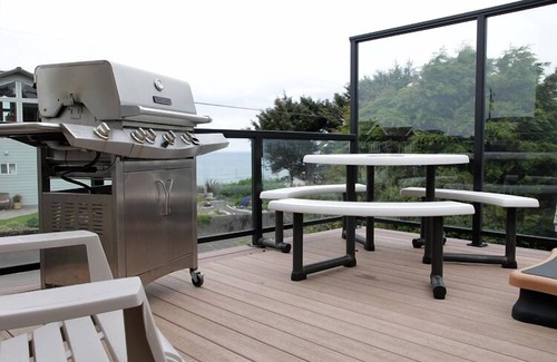 Outside: Upper deck with Views of the ocean, Hot Tub, patio table, BBQ gas grill (connected to natural gas, so no worries of running out of gas). Large yard, mature landscaping, fire pit, back patio with picnic table.