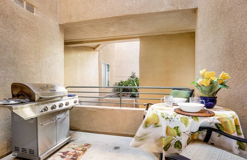 Spend the day at the beach - and don’t forget to grab the beach chairs, umbrella, and boogie board on the balcony - and then come home to relax in the central air-conditioning. Entertainment options include three TVs, one of which is a 75' HDTV, free cable, and WiFi, ideal for uploading the day’s pics to social media. Snuggle up on the leather sofa or recliner in front of the gas fireplace, and drift off to sleep in either well-appointed bedroom. Another perfect Carlsbad day awaits tomorrow.