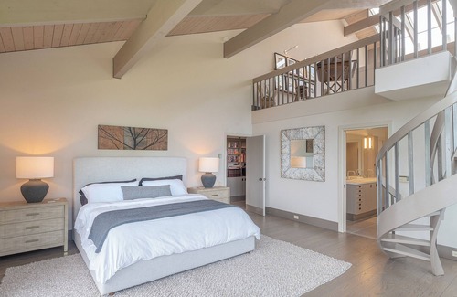 Large 5 bedroom, 5 bathroom Estate located at the corner of Alvarado and Riata in Pebble Beach – steps away from the main gate for The Car week events, the golf course and other Special Pebble Beach Venues. Spacious living areas with Ocean views in the grand room. In this case this is a truly grand room with soaring vaulted ceilings adding to the volume of the Grand Room. The huge quartzite Island in the kitchen makes this a perfect area for entertaining. The Home would also work wonderfully for 2 groups because 2 bedrooms are set aside off of a private living room and kitchen. So that they can be treated as a seperate area. Leaving the main house for the rest of the group. Ocean and Cove views are beautiful and the grand room can see the view from end to end. Master Bath tub looks at the Ocean and ofcourse waking to the view is also wonderful.