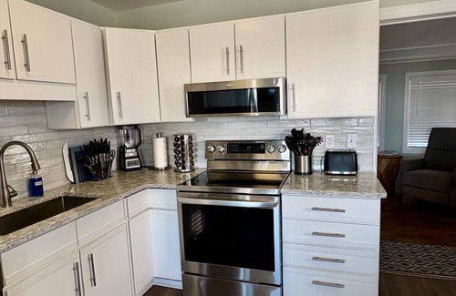 -Sleeps up to 8! The entry to the VRBO house is up the front steps to the main living area, which contains a living room, kitchen, sunroom/office, 2 bedrooms (queens), and a full bath with shower/tub combination. Close the French doors to the sunroom/office and you have an additional private sleeping area for 2 with the daybed (which converts to 2 twin XL beds or 1 queen). The interior staircase leads to a primary bedroom (king) /bath ensuite with walk in shower and a separate laundry room.