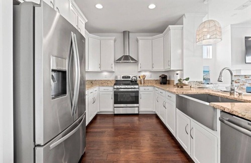Steps to the Beach w Ocean View! Come stay in this newly built townhome with luxurious beach inspired Interior Design. It's in the perfect location with a private backyard pool. This home is located walking distance to restaurants, coffee shops and the ocean! Located in a quiet beach neighborhood and equipped with everything you need for your ideal coastal vacation. Your stay includes beach equipment, Smart TV's with Hulu guest account, 2 bikes, fast WIFI, and a fully stocked kitchen.