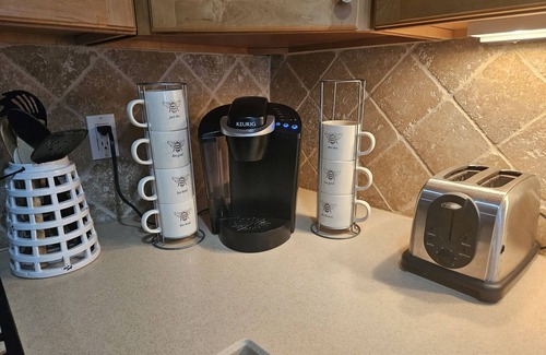 Want to dine in? The full-size kitchen includes a very large refrigerator and freezer as well as a full-size oven, stove, microwave, and dishwasher. Make a few meals or even host a full holiday dinner here. We've got plenty of plates, dishes, mugs, glasses, bake wear, a full cabinet of spices, a regular coffee pot, a keurig, and tea kettle.