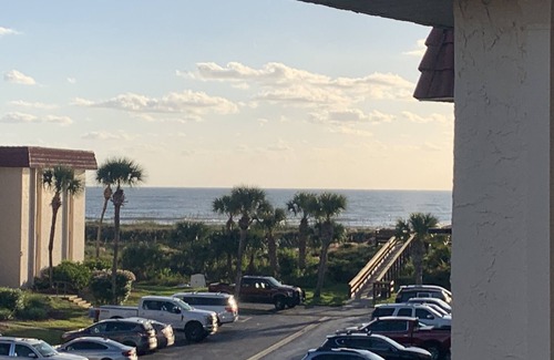 Located in the beach front Ocean & Racquet Resort, this unit has an ocean view and is just steps from St. Augustine Beach. This roomy condo includes 2 bedrooms, 2 bathrooms and can sleep up to 6 in the 1 king size bed, 2 twin beds, and queen pull-out sleeper sofa. Both bedrooms and family room have flat screen TVs. This unit has enchanting views from the balcony of the world-famous St. Augustine Beach with chairs so you can relax with your morning coffee and evening beverage. A convenient elevator offers easy access to this third floor property, situated in close proximity to the wooden boardwalk to the beach.