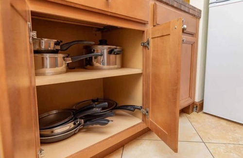 Despite dozens of restaurants being a stone's throw away, the kitchen is equipped with essential appliances, including a refrigerator, freezer, stove, dishwasher, microwave, drip coffee maker (bowl filters provided), toaster, pots & pans, plenty of dishes and a large peninsula with four swivel bar stools. - everything you need to prepare meals and snacks during your stay. A starter set of trash bags, dish soap, dishwasher tabs, paper towels, dish towels and sponge are provided.