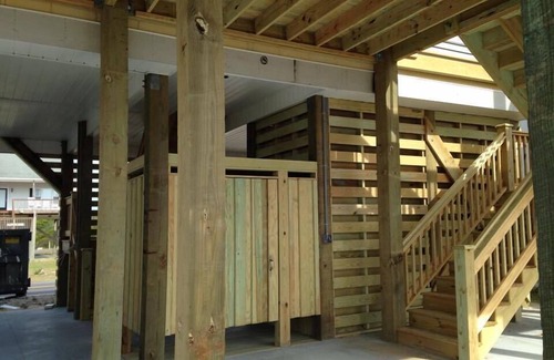 Home equipped with flat screen streaming TVs in family room and all bedrooms, high speed WiFi, and blue ray player with a variety of movies, as well as an assortment of puzzles, games, and books for family enjoyment. Step outside each level onto large decks and take in the amazing views. The top deck is partially covered for shade or for sunbathing. The large, main level deck is complete with small tables and chairs for relaxing and ocean viewing. Begin or end the day on the octagonal conversation deck overlooking the ocean, complete with built in seating.