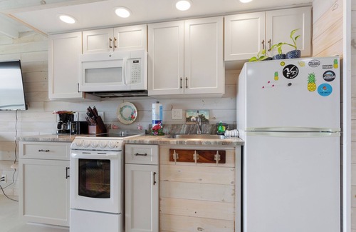This condo has all that you need to enjoy a relaxing Florida beach vacation. Central views of the ocean from the top floor of Beacher's Lodge can be enjoyed from the living room or step onto the private oceanfront balcony. If you want to sleep oceanfront, the sofa is a queen sleeper and the large flat screen tv, custom ceiling lighting and ceiling fan will keep your seaside stay easy and breezy. The fully equipped kitchen has a flat top stove with oven, microwave, Keurig, toaster, refrigerator and is well stocked with dishes. The bathroom has a tub with shower. Retreat to the private bedroom with comfortable queen bed, large Roku TV, custom ceiling lighting and ceiling fan. This condo is unique, but you will certainly find that there is extra special Florida charm throughout. NO PETS ALLOWED.