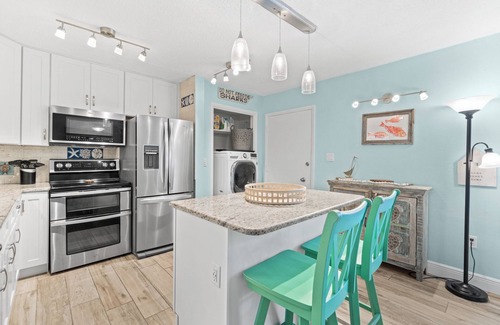 Step into the fully remodeled kitchen, where modern design seamlessly blends with coastal charm. Brand-new appliances, sleek countertops, and fresh lighting make meal prep a joy. The kitchen island, complete with two stools, offers the perfect spot to sip your morning coffee or gather for a casual meal. A side table with wood accents not only adds extra storage but also brings a touch of warmth and style to this inviting space.