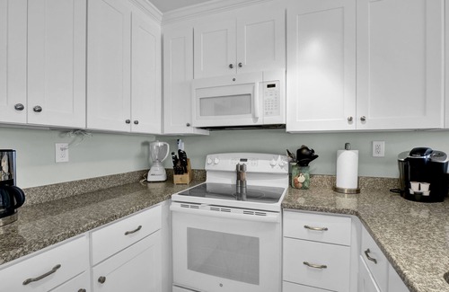 The kitchen features smooth top electric range with built in microwave hood, dishwasher, granite counter tops and a raised bar top.