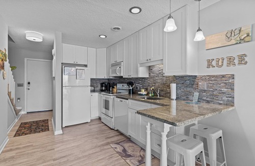This condo has an open floor plan with the kitchen, dining area and living room all on the first floor - & pergo flooring throughout. As soon as you walk in you'll see the large glass sliders out onto the deck, where you will find a high top table and chairs to take advantage of the views! The living room has plenty of seating, a large TV, cable, Roku, and Wi-Fi, and a pull-out queen size sleeper sofa. The dining area seats four at the table and two at the bar. The kitchen has granite countertops, tile backsplash, and is fully equipped - all you have to do is bring your food! Both of the two bedrooms are upstairs. The primary bedroom has sliders out onto to your private deck and, again, incredible beach views. It also has a king-size bed, ceiling fan, TV/cable, and a master bathroom with granite countertops and tile. The second bedroom has two twin beds and a full bathroom right off the hall.
