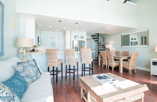 This vacation rental is a modern oasis with high-end appliances and tasteful furnishings throughout. Attention to detail has been given to the shiplap details and the unique spiral staircase that leads to the loft. Enjoy natural light from the wall of windows and bask in the serene oceanfront view from the sundeck. This is the perfect spot for a relaxing, luxurious getaway, with sleeping and bathing privacy for two couples.