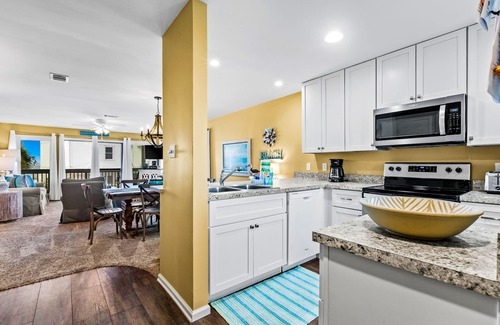 Natural light floods the inside of this condo, from the furnished living room to the fully equipped kitchen. Central air conditioning makes things cool and comfortable, and there's a ceiling fan in each room so everyone can adjust the temperature to their own preferences. The main bedroom also features an en suite bathroom with a double vanity and an oversized stone standalone shower. Just stick the swimsuits and towels in the private washer/dryer and head to the deck - this is your retreat near the beach!