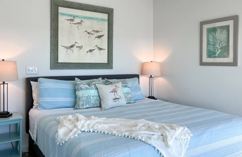 The open Kitchen with its ocean views makes every meal a pleasure, and being fully stocked with amenities doesn’t hurt! There’s a huge prep island with granite counter, an additional eat-in peninsula that seats 3, an oceanside dining table for 4, and a massive dining table for 8. As we continue to look around the dining room, you'll find a separate built-in beverage station! Entertaining here is always a breeze. Off the upper deck is a charcoal grill and picnic table for beach-y lunches and al fresco dinners!