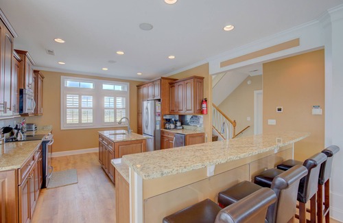 The formal dining room is equally classic, with a long dark-wood table and padded chairs that can accommodate a group as large as 16. Another large window looks out over the ocean, providing you with a permanent oceanfront table for 16. The large kitchen boasts oak cabinetry, granite countertops, stainless steel appliances, and a center island with a vegetable sink. Everything for a fabulous family meal is right at the chef's fingertips. A breakfast bar for four is a convenient addition to the dining table seating.