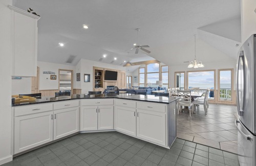 Top Level: Features an open, airy great room with TV/VCR/DVD and sweeping ocean views. The kitchen has 2 dishwashers and a large pantry. The nicely furnished living area has a gas fireplace and an elevated sunroom with extra seating and great views. There is also a King main bedroom with a whirlpool.