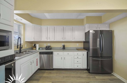 Kitchen and Dining: The fully equipped kitchen includes a stove, oven, microwave, dishwasher, and coffee maker, along with plenty of counter space for meal prep.
