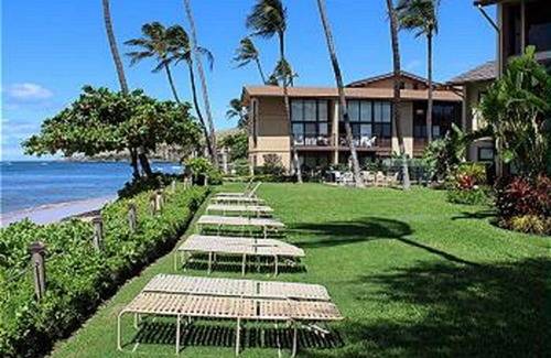 Watch boats coming in and out of the harbor, surfers riding the waves, paddlers, and even whales in the winter. It truly is magnificent! Inside the unit, the master bedroom features a king-sized bed and an upgraded bathroom with a walk-in shower. The second bedroom has twin beds, and the living area even has a sleeper sofa, so it can comfortably sleep up to six people. Cooking is made easy in the clean and well-equipped kitchen, and a BBQ station is perfect for grilling steak from cattle born and grazed on the slopes of Haleakala, all while enjoying the amazing oceanfront ambiance. Lounge chairs are lined up at the edge of the lawn facing the ocean, perfect for some lazy downtime with a good book or for taking a nap. And with AC in the living room, a TV with complimentary cable and internet, and free WIFI, you're sure to have everything you need to stay comfortable and connected during your stay. Laundry facilities are on-site, and complimentary parking is provided for one vehicle per unit.