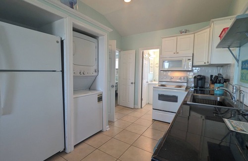 Cozy & fully equipped kitchen with dishwasher, fridge, and range. Living area has ocean views. This home does not include linens and towels. You will need to bring your own, or order through a linen service. We recommend: www.sweetdreamslinen.com