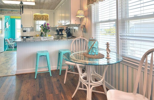 Relaxation awaits you at Wind Beneath My Wings, a charmingly updated original Holden Beach oceanfront duplex cottage. Here on the upper level you'll find 3 bedrooms, two full baths, 4 flatscreen tv's with expanded cable, DVD player, ceiling fans in every room, and hardwood floors. All this is complimented by hand-rubbed whitewashed tongue and groove walls. The kitchen features an eat-in bar, and opens into a bright and cheery great room, perfect for gathering the family 'round for an evening of games or watching a favorite movie.