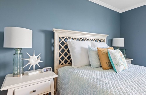 Escape to "The View," a newly renovated 2-bedroom, 2-bathroom condo in Villa Capriani, North Topsail Island, offering stunning Ocean and Villa views. Wake up to breathtaking North Carolina sunrise and ocean vistas from your pillow-top king-size bed in the master bedroom, complete with a mounted TV and en-suite bathroom featuring stunning tile accents and remote-controlled bedroom window blinds.