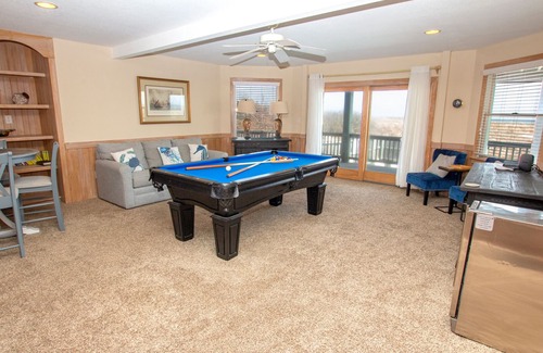 Mid Level: Den with TV/DVD, Queen Sleep Sofa, pool table, deck access, game table seating 4 and ocean views. King Master Bedroom with deck access, Queen Master Bedroom with TV/DVD and deck access and a Queen Bedroom that shares a full hall bathroom with a Bedroom with a Full Bed and Bunk Set . The hot tub is on the deck.