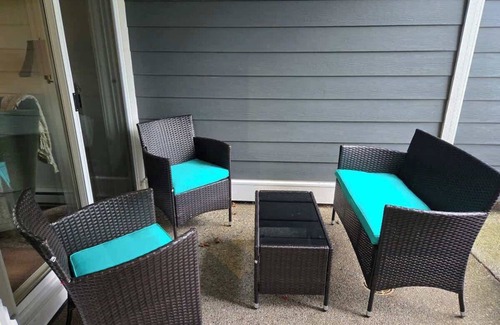 Enjoy the living room with electric fireplace, sofa-bed, and outdoor patio, while the fully equipped kitchen and dining area accommodates up to 6 guests.