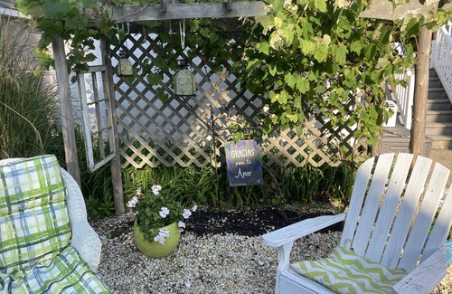 The backyard is spacious & inviting with an arbor for grape growing and a beautiful garden for you to enjoy! The back deck is ground level and the large outdoor table comfortably seats 10 adults. There is a clothes line where you can hang those sandy beach towels and an outdoor shower w/changing room. 10 beach badges (a $450.00 value) are included in your weekly rental for your convenience and you are required to leave the badges upon your departure.