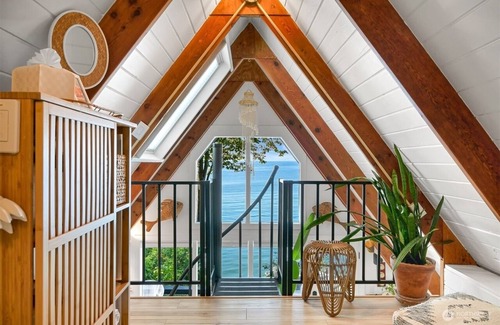 Welcome to Bay Frame, a beautifully renovated Birch Bay A-frame cabin rental perched on high-bank waterfront with 180° sweeping ocean views and direct beach access. This 3-bedroom retreat blends vintage charm with modern amenities, offering the perfect Pacific Northwest getaway for families, couples, a girls trip or remote workers.