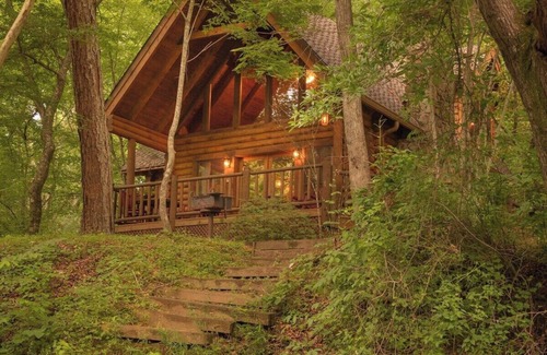 The storybook cabin's vaulted ceiling and floor-to-ceiling windows provide an unobstructed view of the Ocoee River, less than 50 feet from the front porch. The riverfront cabin sleeps up to 7 and features a full kitchen, stone fireplace, and sunken Jacuzzi tub. Outside you'll enjoy river views and private fire pit.