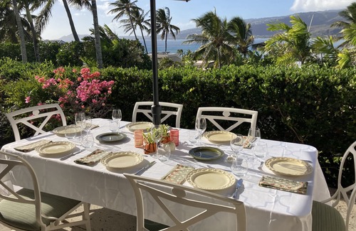 3 Bedroom in Main House(1 King Master Bedroom with en-suite Garden Master Rainfall Shower Bathroom /2 Queen Bedrooms with shared 2 Sink and Shower Bathroom). Fully outfitted kitchen with Subzero fridge, Kitchen Aid blender, Nespresso and everything needed for gourmet meals connected to Family Room and covered Lanai for outdoor eating/relaxing with Roku smart TV, hot tub, swing garden chair, ping-pong table and Kitchen Aid BBQ grill. Main Living Room with Large Smart TV opens to Outdoor Lanai overlooking ocean and mountains for outdoor dining and sitting. Ceiling fans in all bedrooms. Washer and dryer. High speed Wi-Fi.