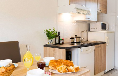 "Odalys Référence Les Hauts de Salavas", 3-room terraced house 40 m2. Bright, practical furnishings: living/sleeping room with 1 sofabeds, 1 pull-out beds, dining table and TV. 1 room with 2 sleeping facilities. 1 room with 1 x 2 bunk beds. Kitchenette (4 hot plates, dishwasher, microwave, electric coffee machine). Bathroom, sep. WC. Electric heating. Terrace. Terrace furniture. Facilities: children's high chair, baby cot. Internet (WiFi, extra). Please note: non-smokers only. Maximum 1 pet/ dog allowed. Smoke alarm. This type of apartment can also be created on two levels.