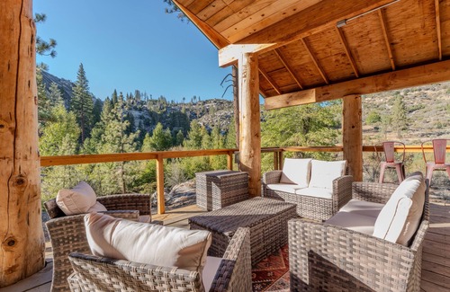 Waterfall Retreat at Peppermint Falls Ranch offers a peaceful, off-grid escape nestled in the heart of nature. This charming cabin, surrounded by towering pines and mountain views, is perfect for those seeking tranquility and adventure. The spacious deck, complete with cozy seating and a hammock, is ideal for enjoying the fresh mountain air and breathtaking scenery.