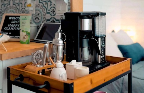 Each of our domes offer luxurious accommodations, AC & heaters, private bathrooms and are built on an individual private decks. Inside you'll find a well appointed kitchenette with a coffee makers, a toaster, a hot plate, microwave, and mini or mid-size fridges, along with most of the related cooking tools. No ovens. A small dining table for 2 and additional seating space to lounge out. Outside you will find BBQ grills, fire pits, a relaxing hot tub and comfortable seating to take in the views. We also provide yoga mats, assorted board games, 2 robes, toiletries, a hair dryer, coffee, tea and sugar.