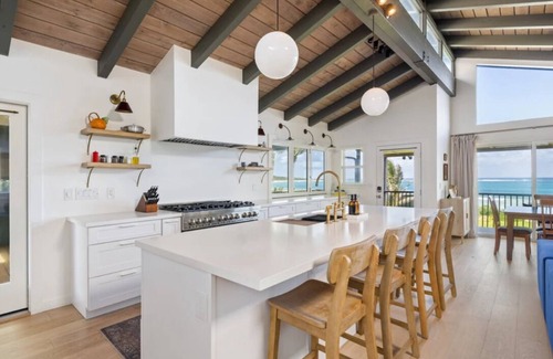 The estate features three separate living spaces connected by a spacious covered deck, ideal for gathering, dining, and enjoying the ocean breeze. The main house offers 4 bedrooms and 2.5 baths, while the charming Ohana (apartment) includes 1 bedroom and 1 bath. A cozy, tiny house completes the retreat, featuring a semi-private loft bedroom, a second loft bedroom, and 1 bath. For larger groups, please inquire about extra sleeping for up to four guests in the Airstream, which includes a private deck and bathhouse.