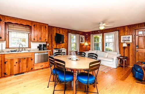 The open living and dining space creates a warm oasis for relaxing and visiting with your family. And while the cottage may be all original, the kitchen has been updated with gorgeous granite counters and gleaming stainless appliances, sure to make mealtime a breeze. The star of the show is an extra-large, sunshine yellow, built-in hutch. Perfect to hold all of your vacation supplies and it even sports USB ports to charge your electronics.