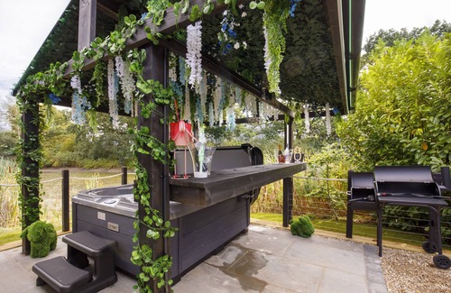 Finishing off with a unique outside space, offering the perfect relaxation and entertainment all in one setting. A luxury hot tub, with a floral ceiling, overlooking the lake. Tub chairs surrounding a log burner, with throws provided for those colder nights.