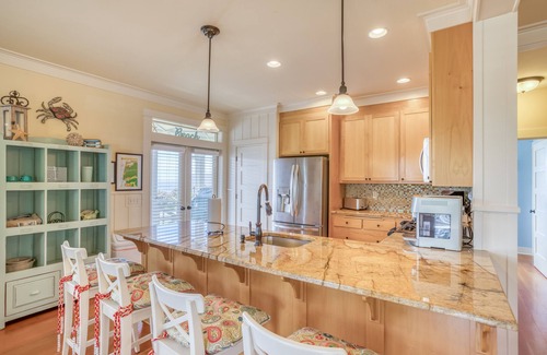 The large dining room has seating for 10, plus the breakfast bar provides a spot for four more! The kitchen is fully stocked to cook for a large group, with service for 20. The spacious open floor plan, breakfast bar, granite counters, and natural gas cooktop make it a pleasure to prepare family meals! The chilled mugs in the freezer should help keep beverages cold while you soak fresh crab in the crab pot or grill some local catch of the day on the American Cooking Equipment Deluxe BBQ. You will find most appliances you need including a 12-cup coffee maker, coffee grinder, griddle, Vitamix blender, waffle maker, artisan bread toaster, ice maker, All-Clad brown and serve slow cooker, second 7 QT slow cooker, Delonghi super-automatic espresso/cappuccino maker and hand mixer too.