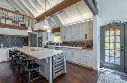 🍷 Gourmet Kitchen: Expansive granite island, built-in wine fridge & microwave, 36" Monogram Professional 6-burner gas range