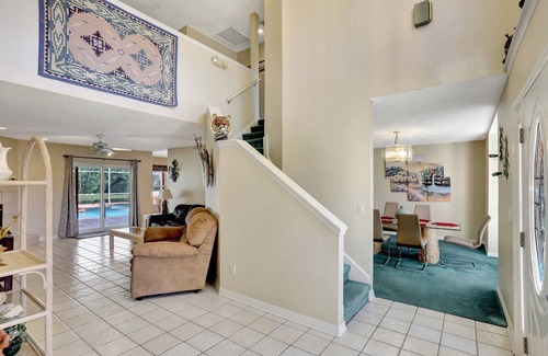 The 2-story villa has many extras to make your stay very enjoyable. When entering the villa the living room is on your left. The dining room is on your right. Straight ahead you step into the family room, with the large, 65" smart cable TV (basic cable via the Spectrum app, plus on-demand streaming through all popular streaming apps). To the right of that room you will find the semi-open kitchen and spacious breakfast nook, seating 6.