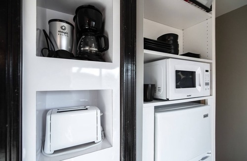 In the custom kitchen, sleek wood cabinets, a granite countertop, and a classic subway tile backsplash create an efficient workspace to whip up a snack, brew your coffee, or fix a meal before hitting the sack. Built-in shelving houses all of the small appliances— like the coffeemaker, microwave, and toaster oven— cleanly and conveniently. Around the corner, a high-efficiency washer and dryer can handle all of your laundry with ease. Outside through the patio doors is a small, sunny, private, fenced-in yard. A Quiet and Peaceful Sleeping Space