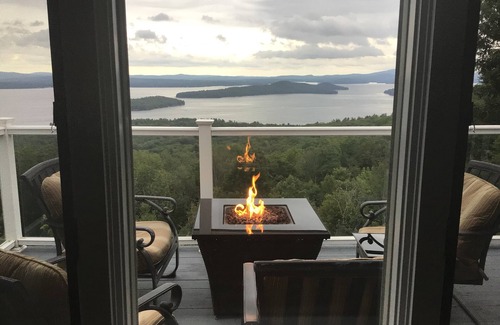 Guests can enjoy panoramic views of the lake seeing ten to fifteen miles of water views of lake Winnipesaukee, trails and slopes from several rooms of this newly renovated home. If your an early riser you can enjoy the beautiful sunrise from the glass paneled deck overlooking the lake ,mountain views as far as your eye can see and at night you can watch some amazing sunsets from the balcony on the other side of the house.If your into star gazing the stars are unbelievable.Guests can cook in, out on the grill or out on the town at a number of local eating establishments. The home sleeps 8 adults comfortably with three bedrooms with queen beds. The living room and common areas are furnished with comfortable leather sofas, chairs, with a table, end tables and a television for the guests viewing pleasure.The glass railed deck has a fire pit and chairs for guests to sit and take in the breathtaking view after boating, swimming, sailing, hiking, running, skiing, sightseeing or shopping. A short ride away from Gunstock Mountain with year round activities and Gilford beach for fun at the lake. There's something for everyone!