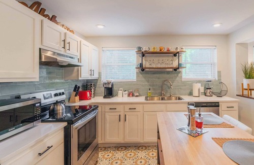 KITCHEN: All stainless appliances and everything you need to cook including spices, oil & vinegar, and any pot/pan you need. We also include some Tupperware, aluminum foil, & baggies to store what you cook. Also included is a large table to enjoy meals together + a washer/dryer to do any laundry you need (detergent and dryer sheets provided)
