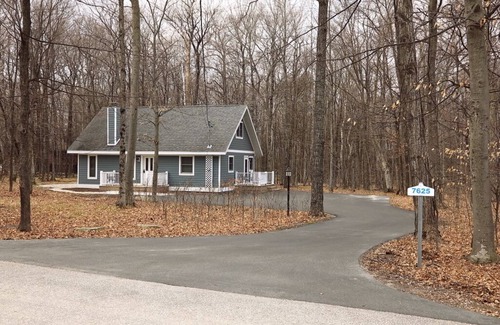Egg Harbor Cottage, open year-round, a chalet located on a wooded lot just a few miles from downtown Egg Harbor. This three-bedroom cottage has been modernized to be your home away from home any time of the year. Dual zoned central air conditioned for your comfort along with a central germicidal air purifier. The main level features three separate entries. The layout includes a spacious master bedroom including a king, and a sizeable closet. Across the hall, one full bath with a jetted whirlpool tub/shower to help you relax. The cottage is equipped with a full amenity kitchen, a walk-in pantry, and stainless-steel appliances, as well as a full laundry with front loading washer and dryer. The dining room table allows seating for six to eight, and a snack bar. The cozy living room has leather furniture, wood burning fireplace, 65" curved screen Smart TV with cable, and a Blu-ray player. The open concept of the dining room and kitchen has a patio door leading to a beautiful, wooded yard for privacy. The second level houses two spacious bedrooms with three queen beds along with closets. One of the second level bedrooms has a 43” Smart TV, Blu-ray player, DVD’s, books, and family games to enjoy. The second level bathroom has a shower.